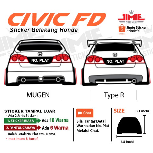 Sticker Kereta Sticker Belakang Honda Civic Fd Mugen Dan Type R Custom Warna Dan No Plat Shopee Malaysia